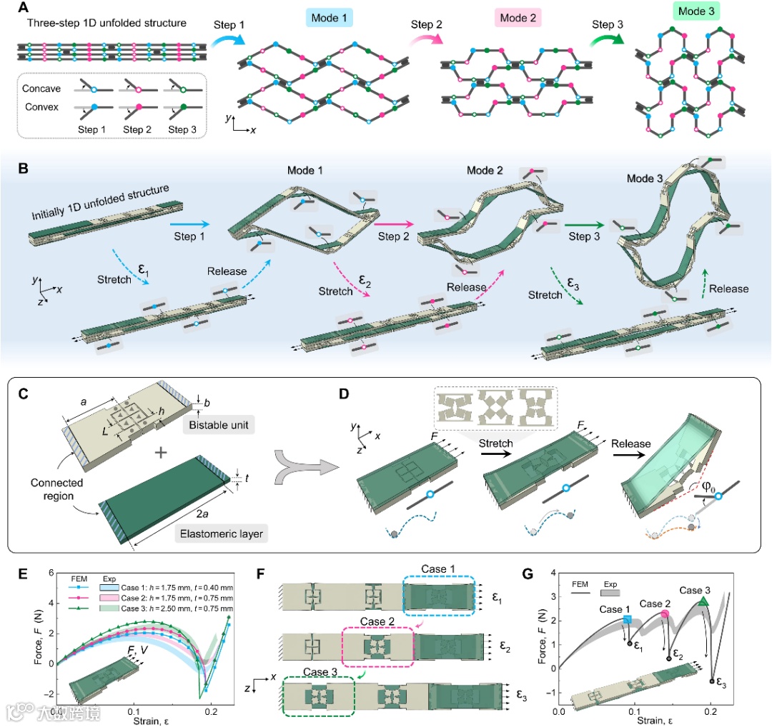 可编程材料可以改变其内部结构用于驱动,应用于机器人和生物医学设备。这得益于工程材料的微结构,可以编码形状重构和拓扑保护,以驱动高强度密度比和不寻常的力学行为(如负泊松比)。目前,基于大尺度折叠的单一转化材料在工程领域广泛应用,包括可展开结构,如折叠桌、血管支架、柔性电子器件和航天器太阳能电池板。许多受折纸启发的可展开超构材料,例如Miura和Kresling折叠模式,从折叠和变形面中衍生出复杂且可控的运动学。基于剪纸的超构材料可以从2D薄片重构为3D目标形状。已经开发出利用力学不稳定性、膨胀、电磁驱动和热膨胀的力学超构材料。通过合理的结构几何设计或组合设计,也可以获得多模态转换材料。此外,可以通过施加不同的驱动和激励来实现具有多重变换的变形,如磁驱动、气动驱动、热驱动和机械驱动。然而,这些系统通常限于在制造过程中必须锁定的单一转换模式,或者需要复杂的驱动或控制模式切换,如耦合旋转和拉伸。大多数材料系统无法通过编程实现基于单一输入的多模态振型转换。