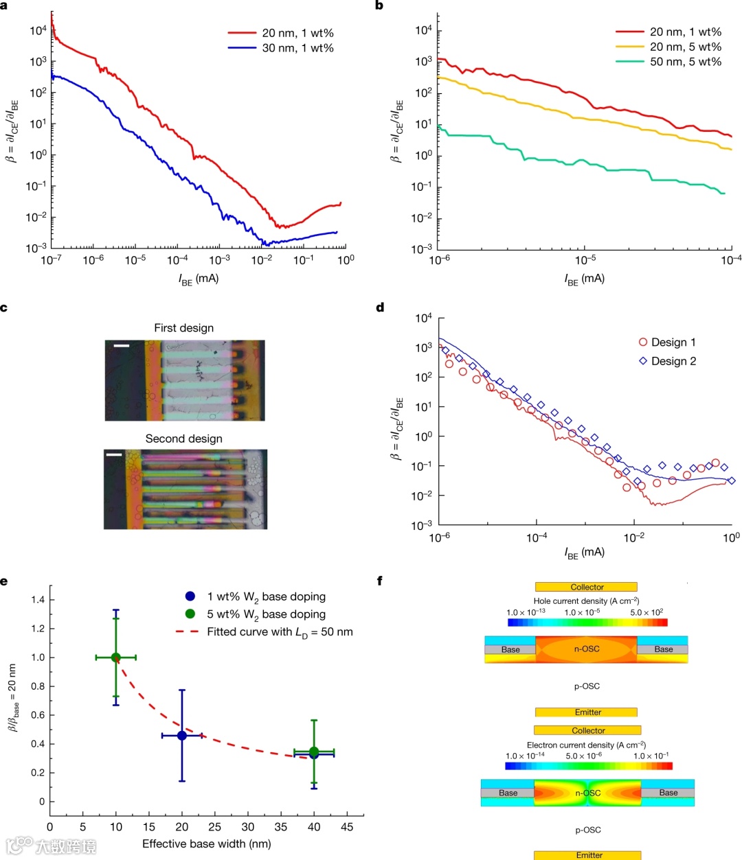 1. OBJT对基区厚度和掺杂浓度的强烈依赖与少数载流子扩散有关,这与基于大多数载流子传输的有机可渗透基区晶体管操作形成了鲜明对比。当所有剩余参数保持相同时,可以估计具有不同基区厚度的器件的扩散长度。图3显示了基于一组新器件的OBJT操作,该设备具有改进的电极几何结构,可减少与晶体管操作无关的电极重叠区域。寄生电极重叠面积的减少改善了晶体管的性能,这与TCAD模拟(图3d)是一致的。