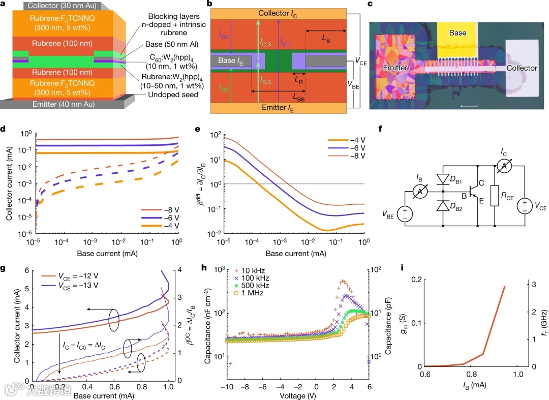 本文展示了具有出色器件性能的有机双极晶体管:一种以前未发现的垂直架构和高度结晶的有机Rubrene薄膜制造的器件,其具有高的差分放大(超过100)和优于传统器件的高频性能。这些双极晶体管还提供了对少数载流子扩散长度的解释,这是有机半导体中的一个关键参数。本文的结果开启了高性能有机电子新器件概念之门,其具有更快的开关速度。