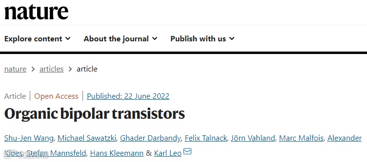有机场效应晶体管(FET)最早于1986年被报道,并在过去的二十年中取得了令人印象深刻的进步。然而,它们仍然局限于低到中等频率的范围,无法得到广泛应用。有机半导体(OSCs)中的电荷迁移率比无机半导体低得多,这限制了有机晶体管的性能。缩短晶体管沟道长度是提高器件运行速度的有效策略,如FET和其他器件(如有机可渗透基区晶体管)。然而,接触电阻和重叠电容等问题往往限制其进一步提高运行频率。