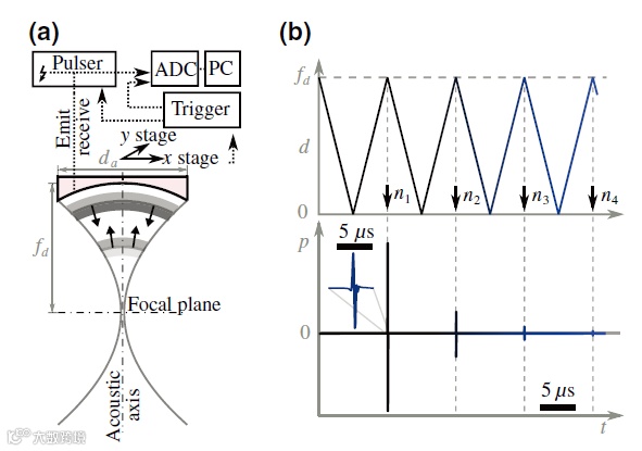 与其他成像技术相比,脉冲回波超声(US)在微观和宏观尺度上对材料和生物样本成像具有几个主要优势,包括易于使用、价格低廉和便携性强。由于其非电离性和非侵入性,US在生物学和医学上有广泛的适用性。利用超声在不同声阻抗介质中传播的时间差,可获得高空间分辨率的样本体积图像。传统脉冲回波技术的扩展包括声速成像、弹性成像和多普勒成像,这些方法利用衬度对比进一步从活体组织中提取有价值的功能信息。除了基于阵列的US成像用于生物医学应用外,扫描声显微镜(SAM)还被用于材料科学和工业应用,用于材料和部件的无损评估(NDE),减少了生产和维护的时间和成本。在超声成像和声纳等其它声学传感应用中,换能器和被成像物体之间的多次反射自然会发生。发射波阵面与成像物体的重复相互作用传统上被认为是一种混响伪影,经常被误判为虚构的声学边界。