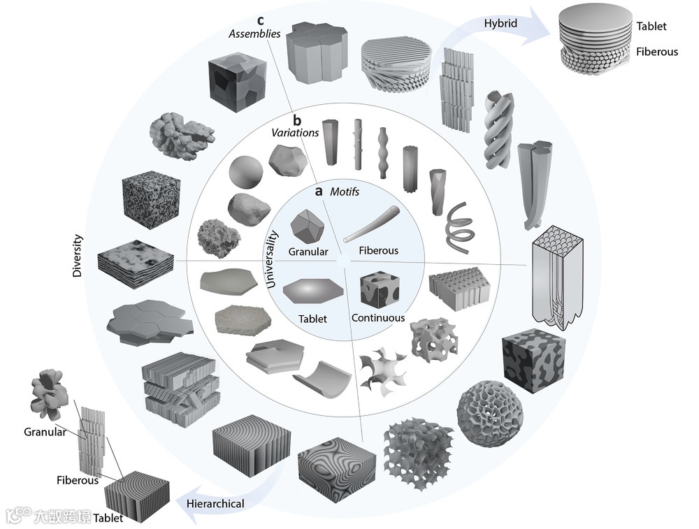 经过数百万年的进化,产生生物矿化材料的生物在自然界中极为广泛。这些矿化生物材料通常是其宿主生物不可缺少的结构,其成分为矿物复合物(如碳酸钙、磷酸钙和二氧化硅)和有机大分子(如蛋白质和聚合物)。典型的结构(如鲍鱼壳),其棱柱层和珠光层均由矿物构件和有机界面组成。贝壳的珠光层和交叉层状结构,仅存在百分之几的有机大分子,但是这些材料表现出比其矿物相高几个数量级的韧性。这些材料具有多种生物功能,包括机械支撑和保护、晶状体、浮力装置、光反射器,矿物储存,重力/声音/平衡/磁传感器,为功能复合材料的仿生设计提供了灵感。其力学性能和其他功能性能是其分级微观结构和生物成分的协同作用的结果。在力学性能方面,生物矿物成分通常比地质矿物成分更强、更坚韧,甚至可以在纳米尺度上表现出显著的可恢复变形。这与小尺寸和材料层级增韧机制有关,包括有机掺杂物、无机元素替代、非晶态相、孪晶、晶体织构等。目前对生物材料结构的了解主要基于2D成像,这常常阻碍对材料复杂的3D微观结构及其力学、功能和仿生设计的全面和准确理解。断层扫描、增材制造和4D测试等3D技术的发展为全面研究3D生物材料开辟了道路。