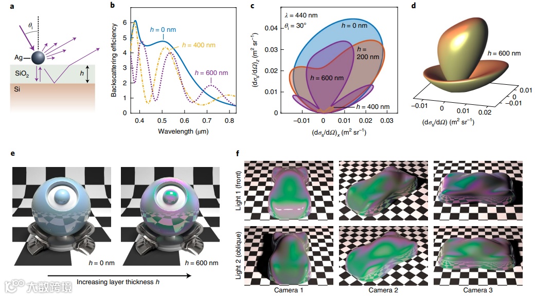 光学超表面是指将高折射率共振散射体以相应序列置于基底上,能够展示出物体各种各样的彩虹色和漫散射结构色。它的实际应用包括用于高分辨率显示器的超薄多色表面,其中共振散射体充当具有多种颜色特性的纳米像素。然而,由于纳米尺度的光学特性很难与宏观尺度的多种外观属性联系起来,光学超表面在外观设计中的潜力仍然没有得到充分的探索。实际上,视觉外观不仅仅是颜色,光泽和阴影依赖于散射光的漫反射和镜面反射成分之间的相互作用,对于人们的物体感知对来说,它们与颜色一样重要。物体的外观还取决于其宏观形状,以及光强和视角。例如,当物体或观察者移动时,可以更好地欣赏彩虹效果。所有这些方面在以前的光学超表面研究中都没有被考虑,在大多数关于自然和人工结构颜色的研究中都没有得到充分的研究。