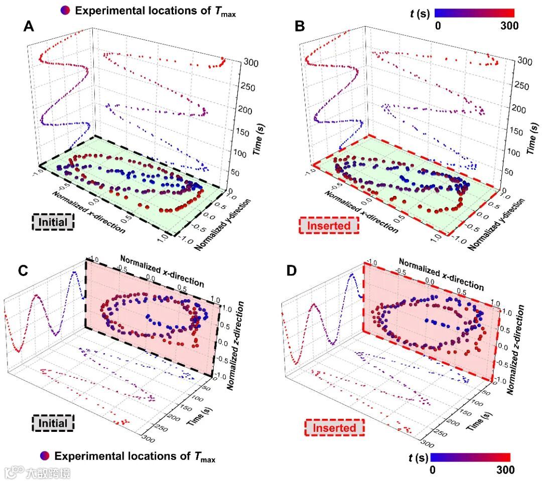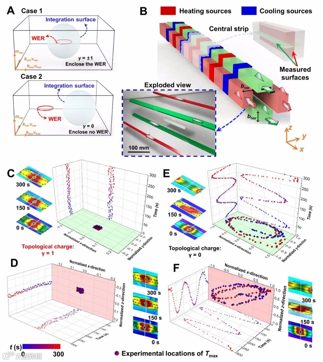 为了验证上述理论验证,研究人员首先在参数空间中计算了相应的拓扑不变量(图2A)。当参数空间中的积分面能够分别环绕或不包含外尔环时,热扩散系统将分别表现出整数倍或零的拓扑不变量。进一步,研究人员设计了如图2B的混合热系统来并在两个正交的中心界面上观测相应的拓扑相变。此时,系统内的对流速度与垂直方向的热交换可以进行相应的调控。相应的实验现象如图2C ~ F所示。当系统的参数空间完全包围外尔环时,系统内呈现出稳定的温度场分布,且温度场最大值的位置在测试过程中维持不变。而当参数空间完全在外尔环外部时,系统内将呈现出运动的温度场分布,且温度场最大值呈周期性分布。