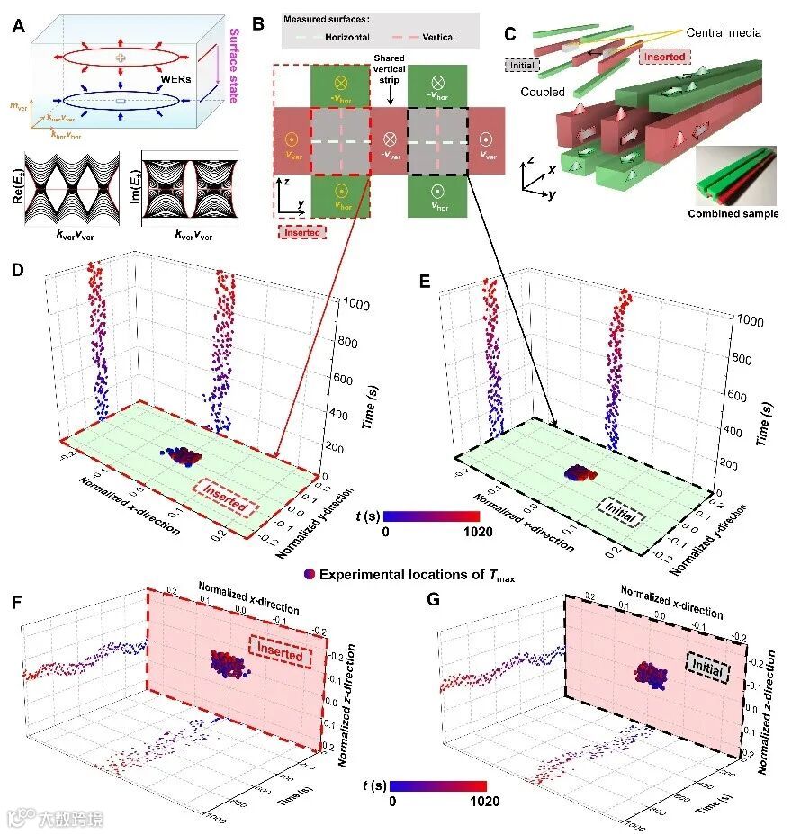 图3. 三维非厄米热扩散系统的表面态以及温度场呈现。在图2B的初始系统中额外插入一个子系统构成双子系统。此时,验证结构内可在上下表面构成具有同质运动的2对绿色对流对,而在系统侧面可等效的自发形成2对红色异质运动对流对。由于异质运动对流对在参数空间积分面上引起的相反的积分方向,两个子系统内可自发的保有相反的拓扑数。