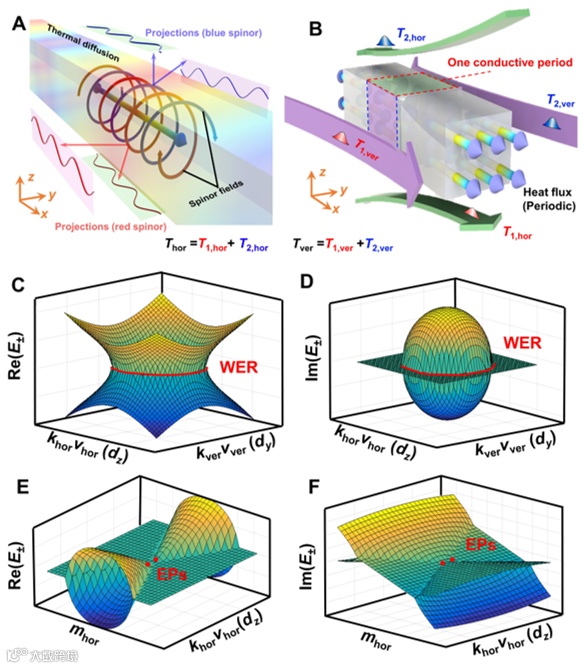 在光子学的验证外尔环实验研究中,通常可通过建立螺旋形波导来创建所需的旋量。如图 1A所示,空间中的两个旋量场可以在四个正交平面中等效解耦出四个周期分布的投影。因此,可以利用这种对应关系来反向的建立等效旋量场。如图1B所示,研究人员在一个静态长方体介质的四个表面上施加四个时空调制对流,且所施加的对流传递方向均沿着x轴的正或反方向。此时,四个对流在系统内可以形成两个等效的对流旋量场,并且系统内热场分布将受到所有热流调制的影响。考虑到对流扩散过程中在的热量交换过程,此时的热系统可以通过对流速度以及热交换率构建出一个三维的可调制参数空间,从而进一步理论预测了外尔环在热扩散系统中的存在(图1C和D)。当其中一对对流对速度为0时,该热系统只具有2个EP点(图1E和F)。