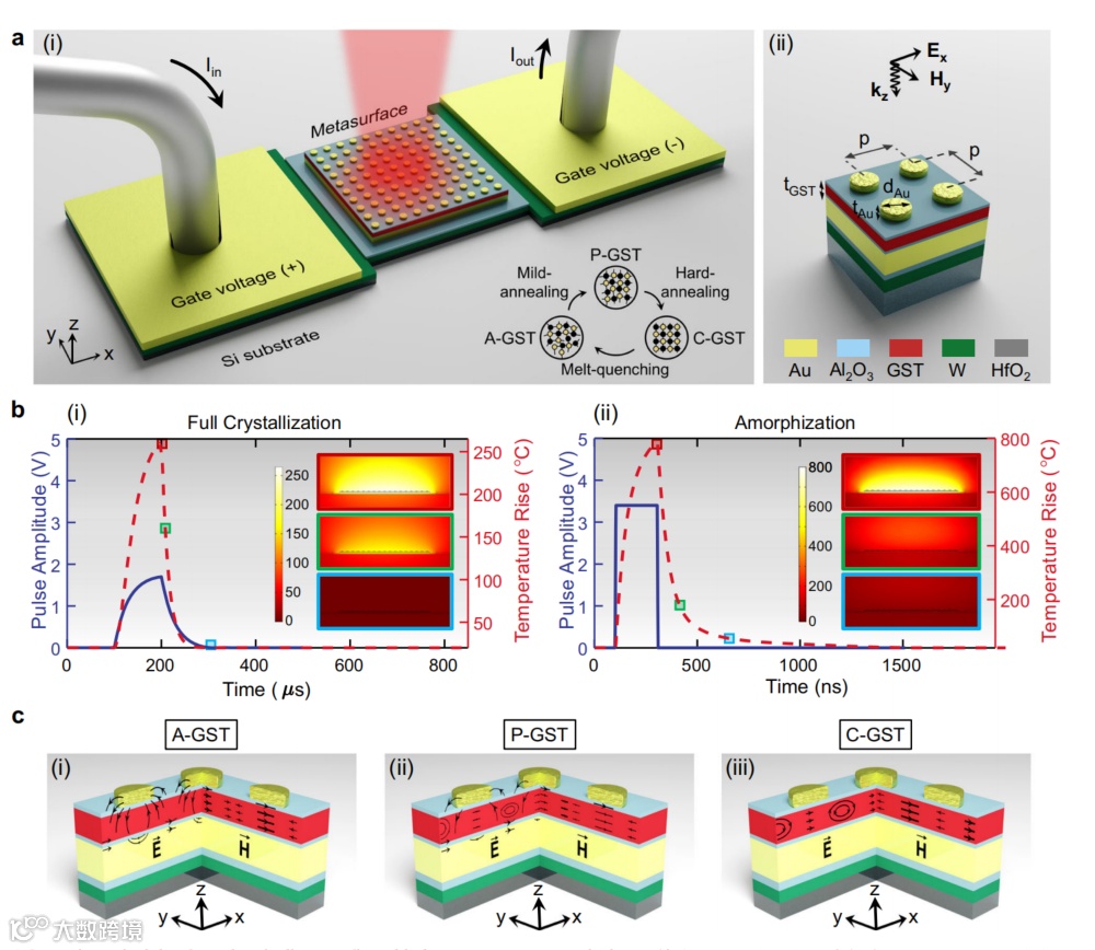 光学超表面是由密集排列的图案纳米结构阵列组成的平面器件,通过对入射光波进行任意的空间和光谱转换,扩展了传统庞大光学元件所实现的大多数功能。为了实现超表面制备后的调谐,可以结合具有可调谐特性的材料平台,如透明导电氧化物、液晶、二维材料、掺杂半导体和弹性体聚合物,利用传统的电光、机电和热光学效应(进行调谐)。尽管在实现可调谐超表面方面取得了令人印象深刻的进展,但现有的大多数演示都存在局限性,包括相对较弱的光调制强度(低Q值的纳米天线)、低光学性能(过度材料损失造成)、低速调制(受可调材料固有特性的限制)和/或具有挑战性的制造(由于非互补金属氧化物半导体(CMOS)友好的制造工艺)。因此,下一代自适应功能系统迫切需要新型高效的材料平台,改善振幅和相位调制的动态范围,便于像素级编程,提高调制速度,降低静态功耗。