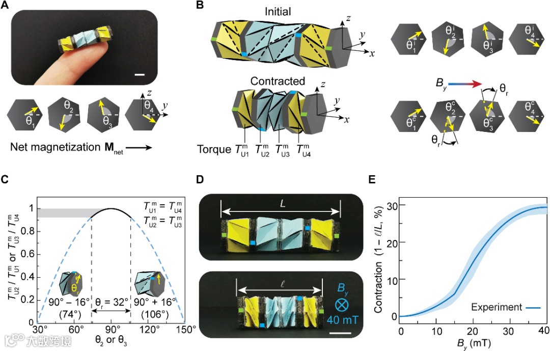 近日,美国佐治亚理工学院Glaucio H. Paulino教授和斯坦福大学赵芮可教授团队报告了一种磁驱动的小型折纸爬行器,用于有效的平面内爬行运动。该爬行器由四个单元的Kresling折纸组成,结构设计合理,避免了组件两端之间的相对旋转,消除了内部扭转,实现了有效的直线运动。通过有限元分析(FEA)从理论上推导和验证爬行器上所需的扭矩分布,以获得所有四个Kresling折纸单元的爬行运动同时收缩。然后通过分布式磁致动实现扭矩。通过控制外部磁场的大小和方向,Kresling折纸爬行器可以实现向前运动和瞬时转向的收缩。不受束缚的磁致动器消除了对笨重和有线致动器的需求,从而实现了小型整洁的机器人系统。沿Kresling折纸爬行器的轴向和横向测量的各向异性和磁可调结构刚度有助于爬行器在严格受限的空间内实现有效的运动。此外,还展示了药物储存和释放能力,以说明爬行器的多功能性。相关研究发表在《Science Advances》上。(徐锐)