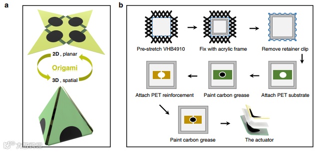 软体机器人在机械和生物医学工程方面具有不可替代的优势。由于其柔软的身体,软体机器人可以调整其身体形状以适应复杂的物理环境,并通过狭窄的通道,这是刚性机器人无法实现的。此外,它们身体柔软的特性也能防止它们接触到的物体受到锐器伤害,使它们能够进入人体运送药物,或在临床手术中充当医疗机器人系统的操作员。事实上,为了提高机器人行走、医疗操作和三维物体抓取的可操作性,构建具有柔性和可变三维结构的软机器人至关重要。目前,3D软机器人通常是通过3D打印和装配小型驱动器来制造的。与3D形状相比,2D形状在空间维度上更节省空间。因此,折纸启发的3D软体机器人构造,源于固有的简化和低成本的基于折叠的装配技术,是一种很好的策略,因为它能够为3D结构构造执行面外变形,并在2D和3D之间切换。这是未来智能机器人系统的理想选择。