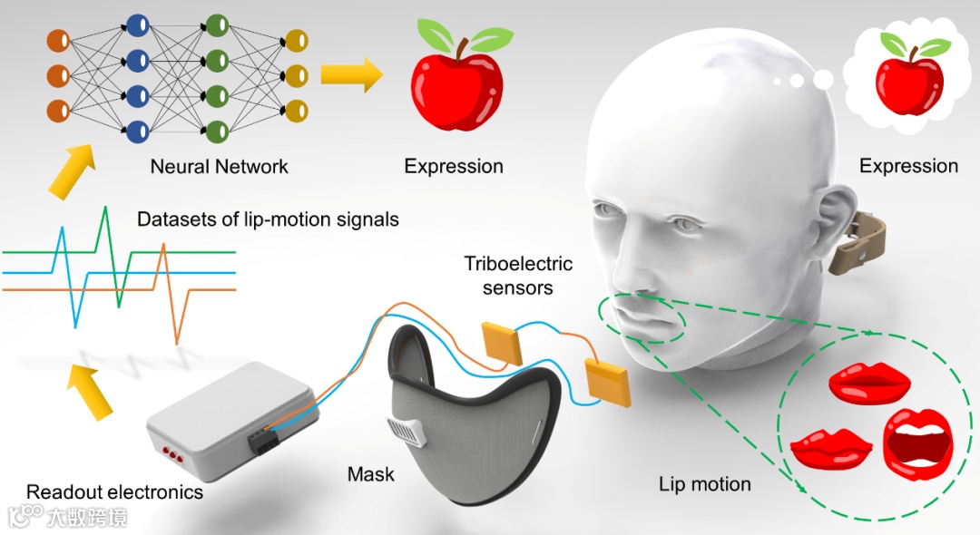 人说话时嘴唇动作跟语音同步,可以通过识别唇动(Lip motion)来进行语言交流。对于声带、喉舌损伤的失声人群,唇语(Lip language)是一种不占用双手的、日常无障碍交流的有效方式。唇语对讲话者友好,但是对解读唇语的听众来说却并不轻松,唇语学习和掌握的成本较高。为降低唇语解读难度,现有技术手段常采用磁场、视觉图像、超声波等方法。以最流行的非接触式视觉图像方法为例,尽管其唇语识别准确率较高,但依然容易受到面部角度、光强、头动和遮挡等因素的干扰。特别是在COVID-19新冠病毒流行期间,佩戴的口罩给基于视觉的唇动解读带来全新的挑战。通过直接捕捉面部肌肉细微动作解读唇语技术具有重要的科学研究价值与广阔的应用前景。