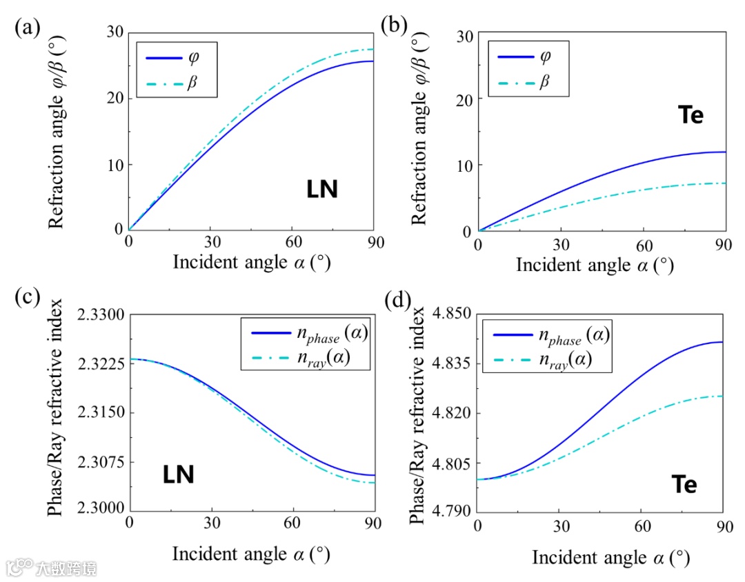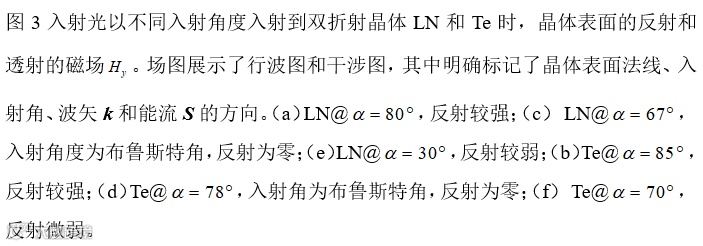 针对古老的双折射晶体光学的困难,华南理工大学李志远教授研究团队发展了一种基于电磁理论的简易方法,能够以简明扼要的方式建立单轴晶体晶体光学的完整图景。该方法遵循光波的传播过程,从基本的麦克斯韦方程组出发,结合边界条件匹配,利用波矢量的对称性给出了双折射介质中的波矢色散关系。该方法不仅给出了双折射晶体众所周知的椭圆折射角和折射率,而且揭示了许多相关的物理量和光学量,这些物理量和光学量被研究和了解的相对较少。首先是在给定入射角下,计算了光在晶体表面的振幅和强度的反射系数和透射系数,并展示了晶体内的电磁场分布。接着推导了光的波前折射角和能流折射角,以及相应的相位和光线折射率。发现相位折射率满足经典的折射率椭圆和斯涅尔定律,而光线折射率不满足。此外,还揭示了零反射布儒斯特角和全内反射临界角的显式表达式。为了更好地演示概念,以弱双折射铌酸锂晶体和强双折射碲晶体为例,进行了理论计算。并且对z切铌酸锂板进行了实验测量,发现理论和实验在布儒斯特角方面有很好的一致性。