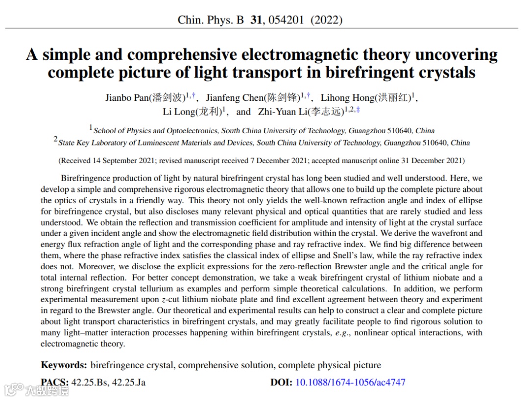 Jianbo Pan, Jianfeng Chen, Lihong Hong, LiLong and Zhi-Yuan Li, “A simple and comprehensive electromagnetictheory uncovering the complete picture of light transport in birefringentcrystals”, Chin. Phys. B 31, 054201 (2022).