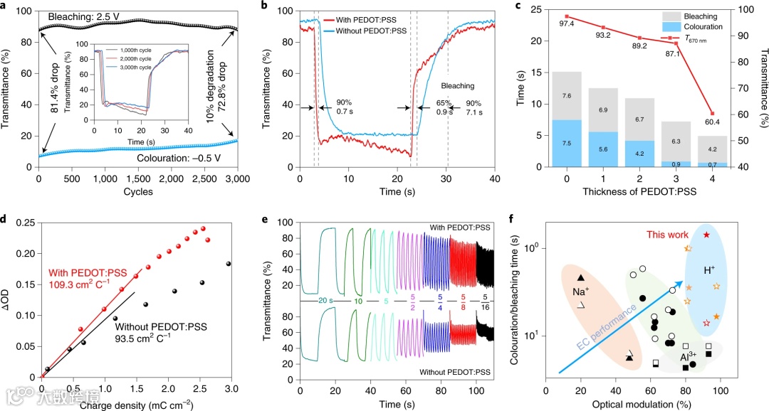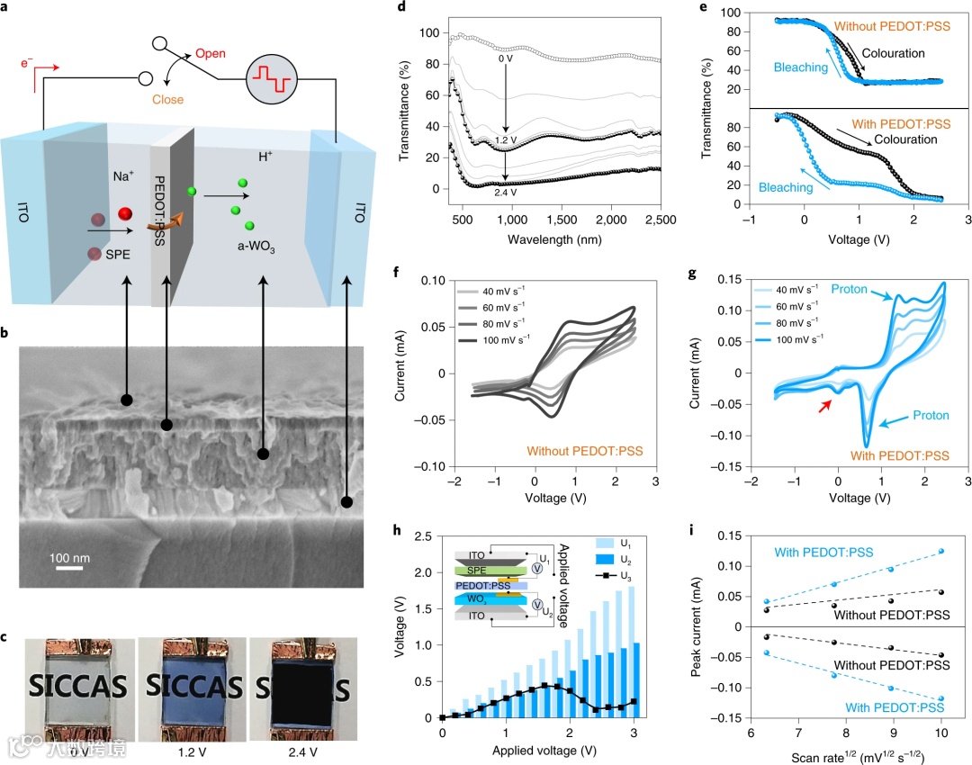 3、从图2g中还可以看出,即使着色也有两个峰。但这两个峰表现出相似的扫描速率依赖性,即具有相似的离子扩散速率,这说明图3b中的着色不存在两个阶段。作为比较,在没有PEDOT:PSS层的情况下,传统SPE/WO3结构的结果也如图3b所示。引入PEDOT:PSS层可以清楚地看到显著改善。