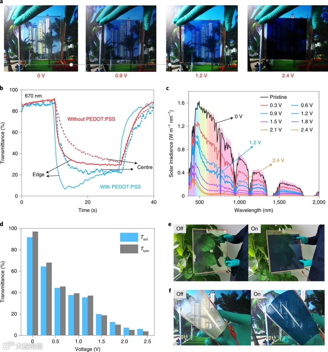 3、透过率光谱转换的太阳辐照度如图4c,d所示,显示了更高的全太阳光谱对比度。此外,本工作还制作了一个30×40cm2的窗口。将PEDOT:PSS分散液通过喷头喷洒得到PEDOT:PSS层。然后,将薄膜在80℃下脱水12min。如图4e所示,也可以实现均匀着色。10×10 cm2的柔性ECD如图4f所示。该装置在弯曲时工作良好,显示出在全固态串联结构ECD的灵活应用方面的巨大潜力。