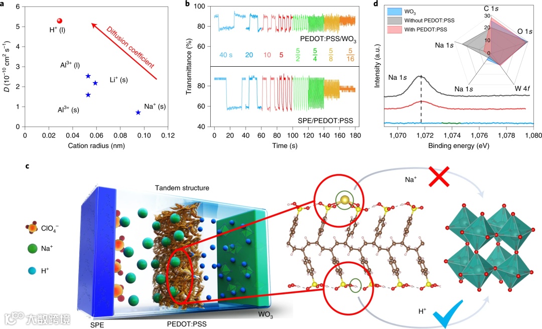 3、图1c显示了五层串联结构的示意图,即ITO/SPE/PEDOT:PSS/WO3/ITO,预期的工作机理是质子是WO3层的主要插入离子,负责着色。SPE层只向PEDOT:PSS层提供Na+,但Na+并未大量扩散到WO3中。相反,Na+主要起通过离子交换过程将质子抽出。