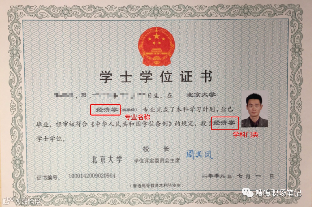 放一张我的一张双学士学位证书,第一个「经济学」是专业名称,第二「经济学」是学科门类。