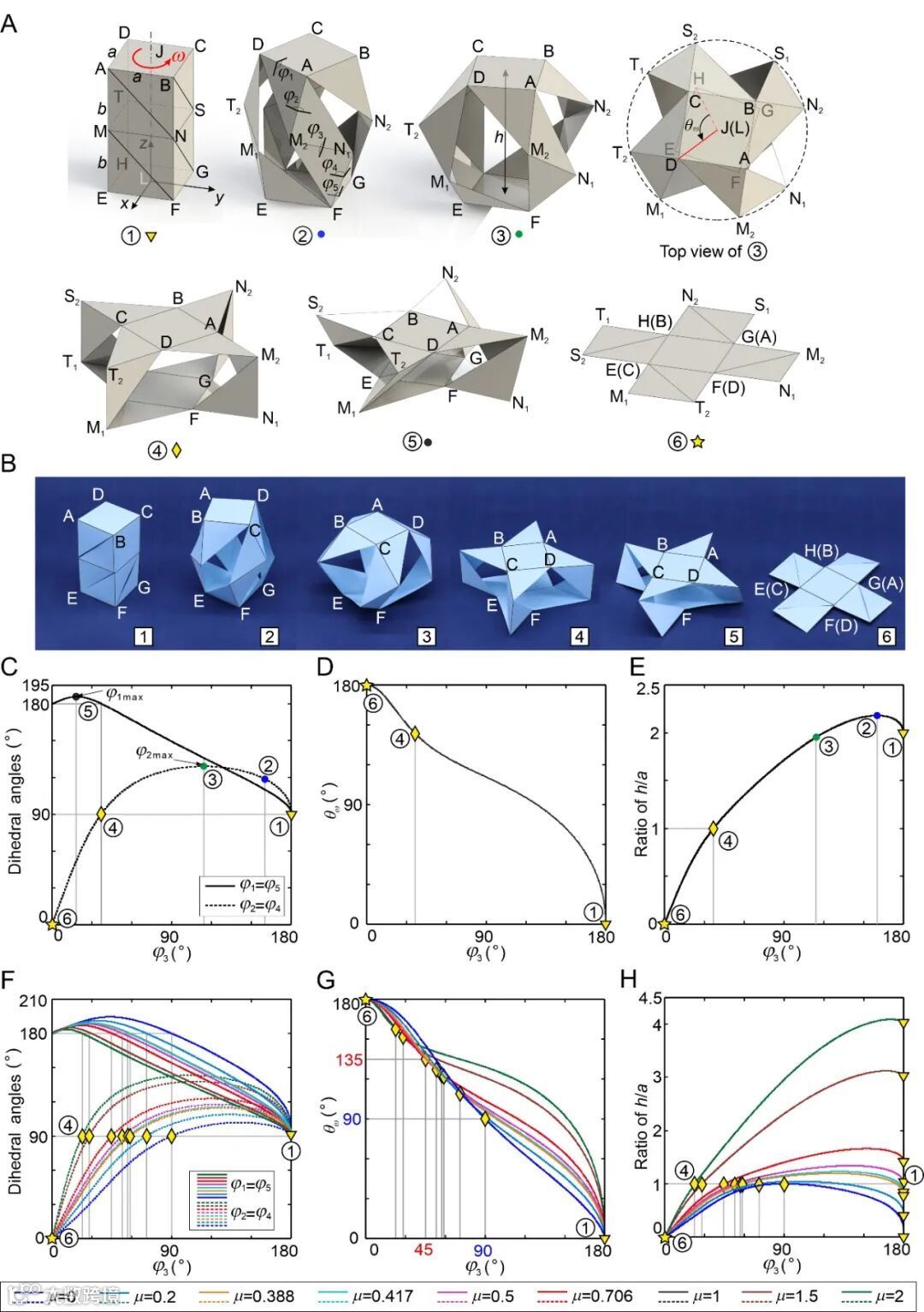 ① 长方体状态(φ1 = φ5 = φ2 = φ4 = 90°),④ 完全展开状态(φ1 = φ5 = 180°, φ2 = φ4 = 90° ) 和 ⑥ 完全折叠状态(φ1 = φ5 = 180°, φ2 = φ4 = 0)。(如图1所示)
