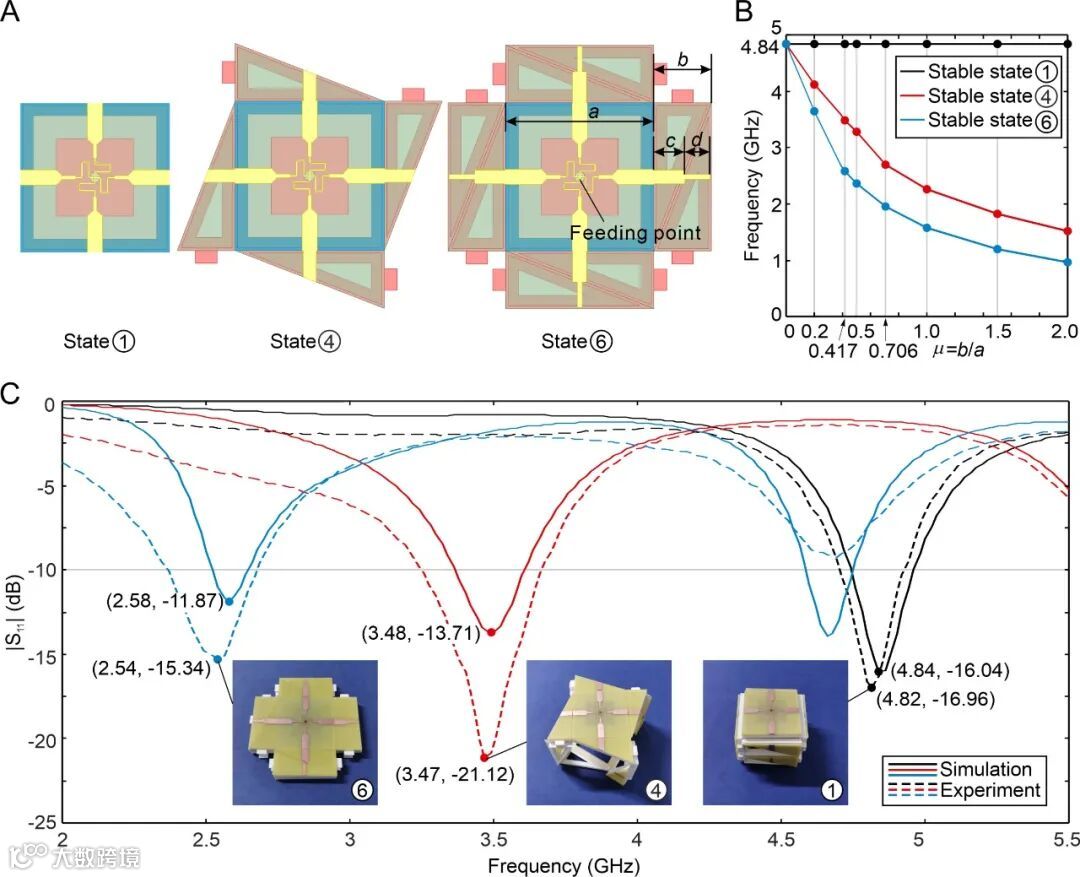 最后,团队进行了三稳态结构在频率可重构天线上的应用研究,并通过参数分析方法,设计了一种可实现5G三频段通讯的频率可重构天线,其三个稳态 ①、④、⑥ 的工作频率分别集中在4.84GHz、3.48GHz和2.58GHz。通过实验验证了频率可重构天线仿真结果的有效性,同时证明了三稳态结构在频率可重构天线上应用的可行性。(如图4所示)