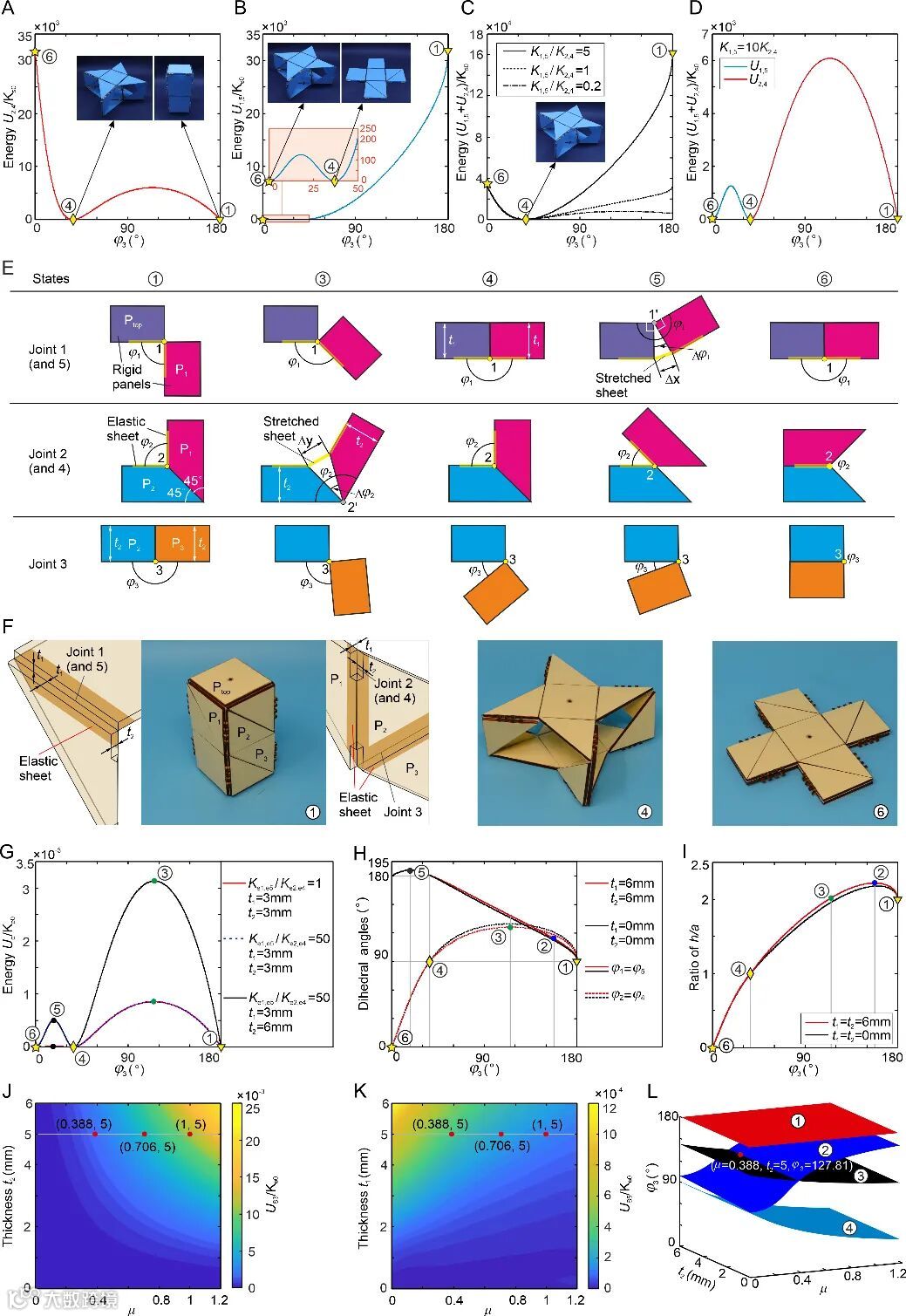 该研究利用剪纸技术,通过设计新型弹性铰链成功构造具有零能量三稳态单元,并基于该单元设计了一系列可编程多稳态超结构。该项研究将为多稳态结构的设计提供新单元和新途径,有利于频率可重构天线、可调控超材料、可展结构、可重构机器人等方向的发展。