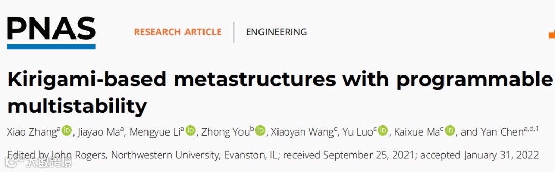 Xiao Zhang, Jiayao Ma, Mengyue Li, Zhong You, Xiaoyan Wang, Yu Luo, Kaixue Ma, Yan Chen*, Kirigami-based Metastructures with Programmable Multistability, Proceedings of National Academy of Sciences of the United States of America, PNAS, 2022, 119(11), e2117649119, https://doi.org/10.1073/pnas.2117649119