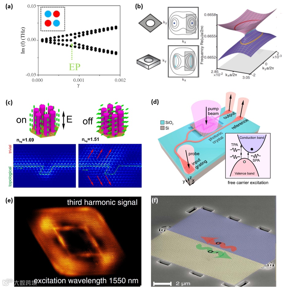 图2 拓扑光子晶体应用于(a, b)非厄密光学系统、(c, d)光开关、(e)非线性光学系统与(f)量子光学系统。