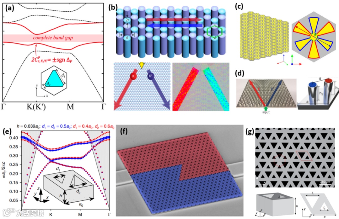 图1 能谷霍尔相光子晶体的(a, b)理论提出与实验上在(c, d)微波波段、(e, f)近红外波段与(g)太赫兹波段的实现。