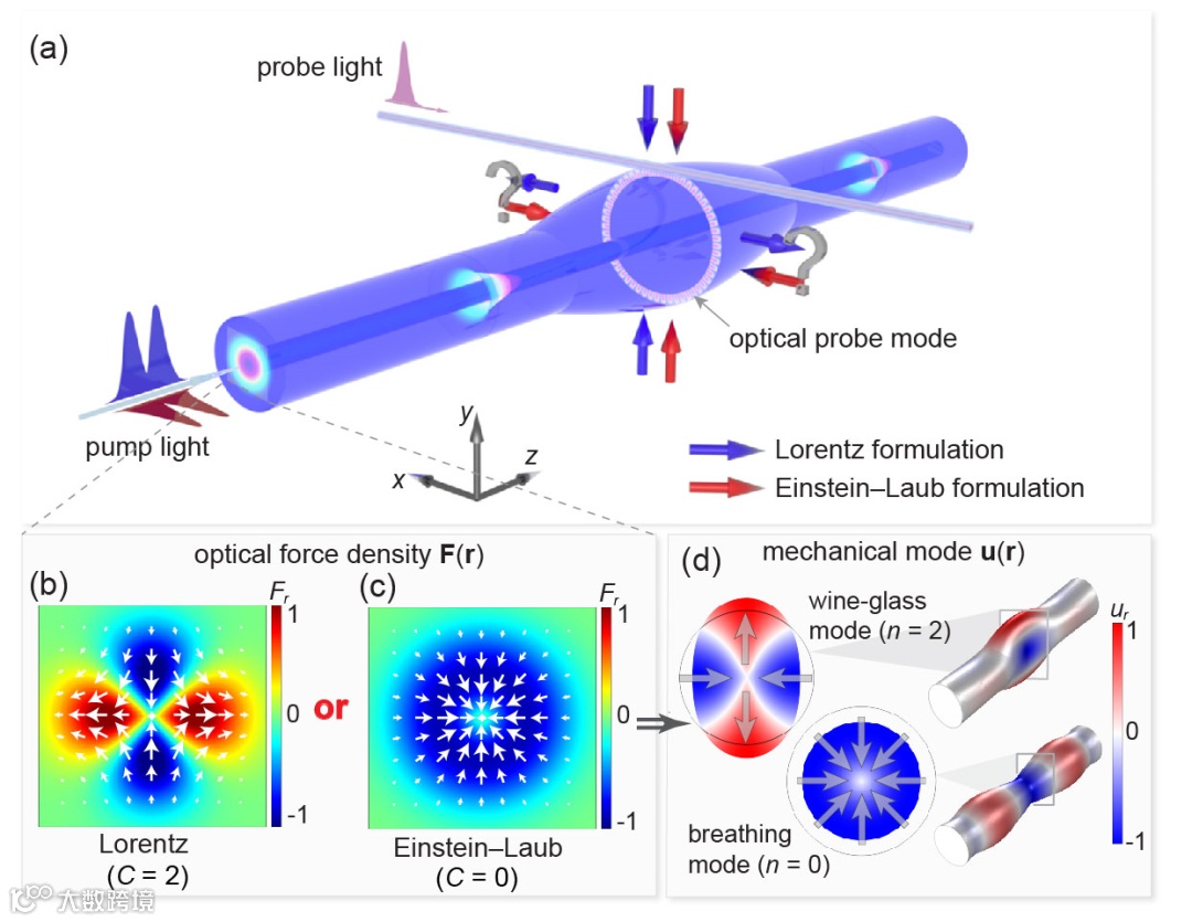 图1.(a) 实验装置示意图。(b) Lorentz公式给出的光纤截面上光力场的分布图。(c) Einstein–Laub公式给出的光纤截面上光力场的分布图。(d) 光纤特制瓶状结构的机械模式模场图。