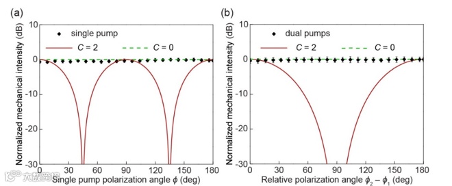 图2和图3是主要测量结果。作者分别使用一束泵浦光和两束泵浦光去驱动两个机械模式,用一束探测光去探测光纤的机械形变。实验中改变泵浦光的偏振角,观测两个机械模式各自的响应。实验发现,所有对角模式数为2的机械模式的测量结果都与偏振角相关,这符合关于角模式数为2的光力的预测;所有对角模式数为0的机械模式的测量结果都与偏振角无关,这符合关于角模式数为0的光力的预测。因此,在光纤内传输的高斯光束导致的光力既有角模式数为2的分量,又有角模式数为0的分量。作者进一步通过微扰理论仿真分析,发现这两个力分量在大小上处于同一数量级。