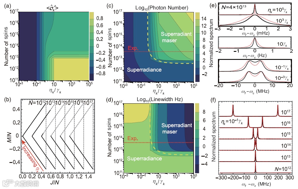 在最近几年,人们利用金刚石氮空位(NV)色心和微波谐振腔实现了拉比振荡、超辐射脉冲和受激发射现象。这些现象依赖于自旋和微波光子间的集体强耦合,而集体强耦合是实现超辐射激光的必要条件。本文研究NV自旋系综和微波光子的集体相干耦合,以及基于此的超辐射微波激射。研究结果表明,通过对多于1014个自旋进行速率为千赫兹的非相干泵浦,可获得线宽小于毫赫兹的超辐射微波激射。此外,本文也证明了超辐射微波激射并不会被NV色心自旋的非均匀展宽所破坏,并研究了其对不同物理参数的依赖性。