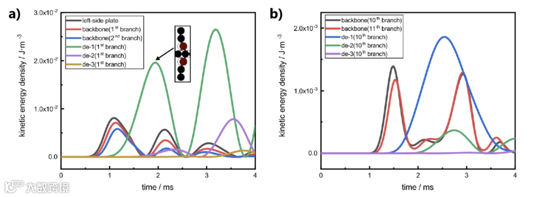 通过对结构中各处的能量密度分布,以及该分布随时间的演变过程的分析,便能够从微观角度描述声音的传播过程。可以发现,声能首先从最左端的"接收板"耦合进入结构,并开始向后续骨架结构传播。当结构上所传输的声振动(或力流)进入悬空链时,会在悬空链形成的多级弹簧谐振系统中经历另一种横向振动模式,在造成延迟效应的同时,也会造成一定的声能分流。