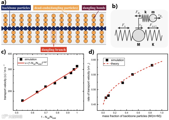 图一:(a).模拟氧化硅气凝胶的典型微结构,蓝色部分为骨架,橙色部分为盲端。(b).多级弹簧谐振系统分析模型示意图。(c).声传播速率与骨架粒子比例的关系,盲端粒子数表示为