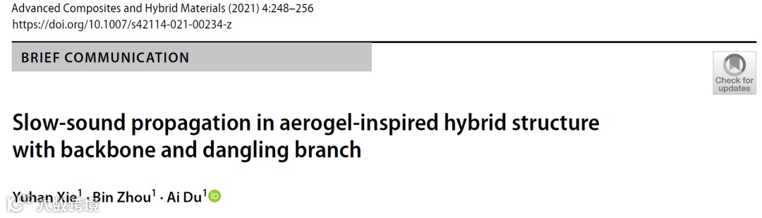 距离Frick课题组发现气凝胶中的超低声速效应(最低约为100 m/s)以来已经有30年的时间(J Non Cryst Solids 1992, 145: 217–222),虽然该组提出了气凝胶中棒状骨架弹性非线性的定性解释(Phys Rev B 1992, 45, 12774),但对于其中微观相互作用的理解还不清晰。以氧化硅气凝胶为例,其密度低(99%以上的空间都是空气),且最大可分辨尺寸相对于声波为深亚波长(<100 nm),为什么能与声波发生强的相互作用,导致声速大幅降低,这还是一个困扰学界的问题。Brinker课题组在2007年提出,氧化硅气凝胶中模量-密度关系表现为指数为3.6的幂函数关系,这是由于气凝胶中大量未连接的悬挂键(或称盲端)造成的,这为理解低声速问题提供了一个合理的微观假说(Nat Mater 2007, 6, 418–423)。近日,以“Slow‑sound propagation in aerogel‑inspired hybrid structure with backbone and dangling branch”为题发表在《Advanced Composites and Hybrid Materials》的工作中,同济大学物理学院的团队研究构建了一种由主链和悬挂键组成的杂化结构模型,以此半定量地研究气凝胶与声波的相互作用,解释了为什么具有低密度、深亚波长微结构的气凝胶可以与声波强烈地相互作用,并解开了30年来气凝胶密度-声速标度关系的哑谜,为超低声速效应提供了一个自洽的微观模型。