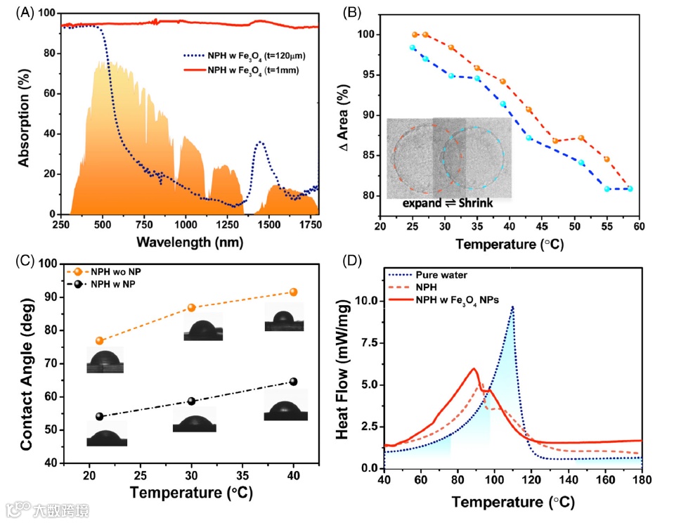 图3. (a)在120µm和1mm的薄膜厚度下,含Fe3O4颗粒的NPH水凝胶的UV-Vis-NIR吸收光谱。(b)当水凝胶周围的水被加热时,用光学显微镜捕获的3D打印的NPH水凝胶的温度响应。(c)纯NPH水凝胶和含Fe3O4颗粒的NPH水凝胶的接触角及其温度的影响。(d) 水在含Fe3O4颗粒的NPH水凝胶内的DSC热流信号