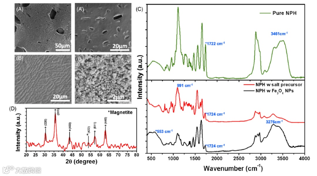 图2 3D打印的NPH水凝胶的微观形貌表征。(a-b)NPH水凝胶和Fe3O4纳米颗粒的低倍和高倍SEM图像。 (c)纯NPH水凝胶和具有Fe3O4纳米颗粒的NPH水凝胶的FTIR光谱。(d)NPH水凝胶内Fe3O4纳米颗粒的XRD谱。