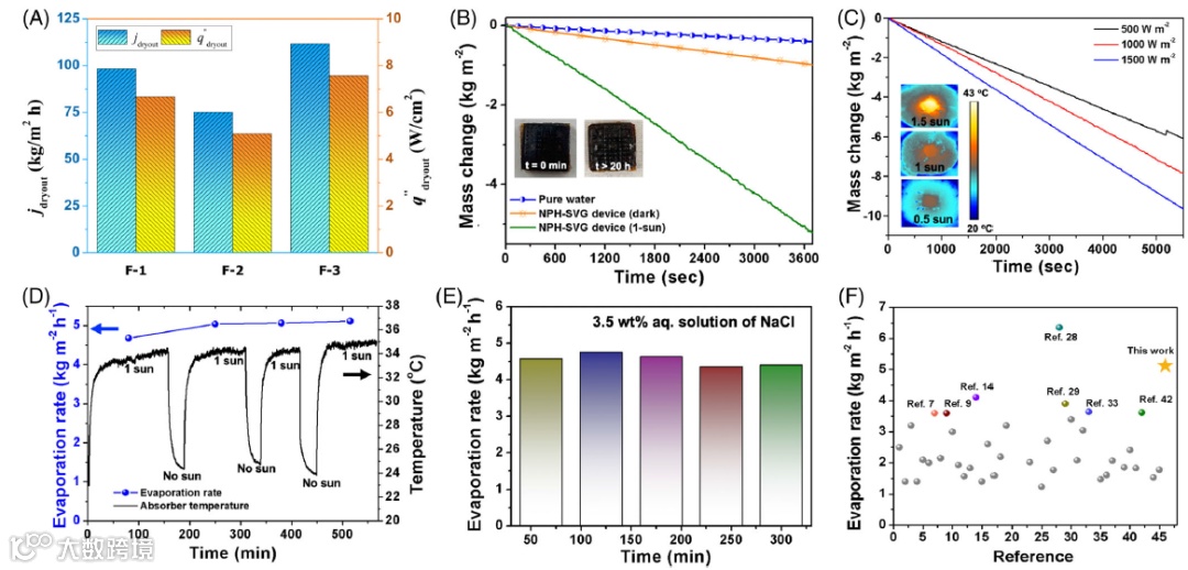在日常阳光照射下,该NPH器件的水蒸发速率约为5.12kgm-2h-1。这种超高的蒸汽生成率与Fe3O4纳米颗粒诱导的水凝胶网络内的润湿性转换和水活化能力有关。为了进一步研究该装置的整体稳定性,该团队还在不同强度的太阳辐射和盐水(3.5 wt% NaCl溶液)下进行了一系列实验。与最初的实验结果一致,3D打印的NPH水凝胶装置在500、1000和1500Wm-2的模拟太阳强度照射下表现出了显著的蒸发速率,分别为3.96、5.12和6.48kgm-2h-1,分别如图3所示。与先前报道的基于水凝胶的材料相比,该工作提出的NPH蒸发器表现出超高效的太阳能水蒸发能力,在太阳能污水处理和海水淡化方面具有巨大应用潜力。
