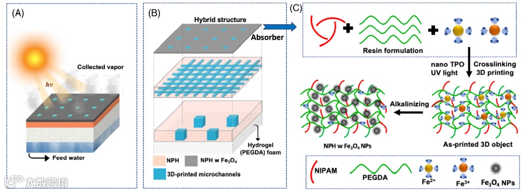 图1. (a)基于3D打印的含金属纳米颗粒水凝胶NPH复合材料的 SVG 装置示意图。(b)在水凝胶PEGDA泡沫和互连的微通道网络内毛细力驱动的水输运。(c) 用Fe3O4纳米颗粒加强SVG蒸发表面的光吸收能力。