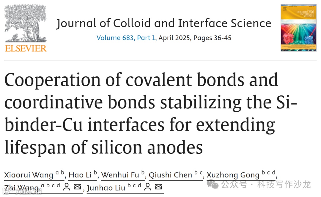 该成果以Cooperation of covalent bonds and coordinative bonds stabilizing the Si-binder-Cu interfaces for extending lifespan of silicon anodes为题发表在《Journal of Colloid and Interface Science》期刊。