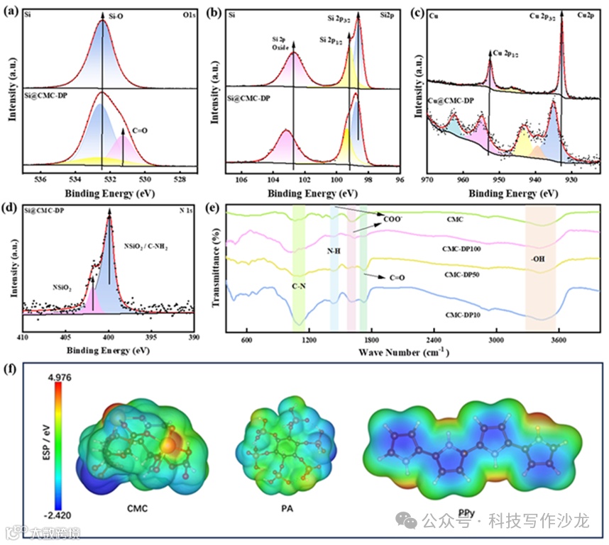 图 2.三维交联粘合剂 CMC-DP 的设计和表征。(a) Si 和 Si@CMC-DP 的 O 1s XPS 谱图。(b) Si 和 Si@CMC-DP 的 Si 2p XPS 谱图。(c) Cu 和 Cu@CMC-DP 的 Cu 2p XPS 谱图。(d) Si 和 Si@CMC-DP 的 N 1s XPS 谱图。(e) 粘合剂 CMC 、 CMC-DP10 、 CMC-DP50 和 CMC-DP100 的 FTIR 光谱。(f) 通过 DFT 计算得到的羧甲基纤维素、植酸、聚吡咯的表面静电电位分布。