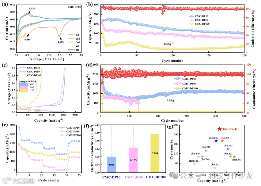 图 4.样品的电化学性能分析。(a) 使用交联粘合剂 CMC-DP10 的 Si 阳极的循环伏安法。(b) 0.2 A/g 下的循环性能,(c) 放电/充电曲线,(d) 1.0 A/g 时的循环性能,(e) 倍率能力,以及 (f) 使用交联粘合剂 CMC-DP10、CMC-DP50 和 CMC-DP100 的硅负极的电子电导率。(g) Si@CMC-DP10 与以前报道中的其他 Si 粘合剂负极的容量比较。