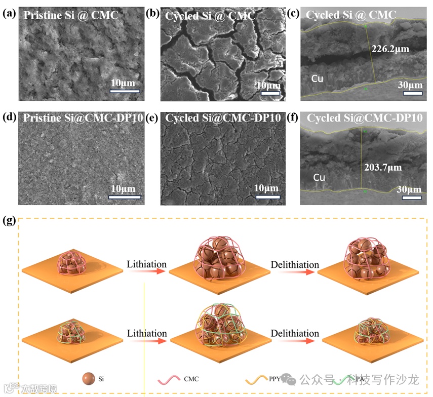 图 5.(a) 原始表面,(b) 循环表面,(c) Si@CMC阳极的循环横截面的 SEM 图像。Si@CMC-DP10 阳极的 (d) 原始表面,(e) 循环表面,(f) 循环横截面的 SEM 图像。(g) Si@CMC 和 Si@CMC-DP 负极的锂化/去锂化过程示意图。