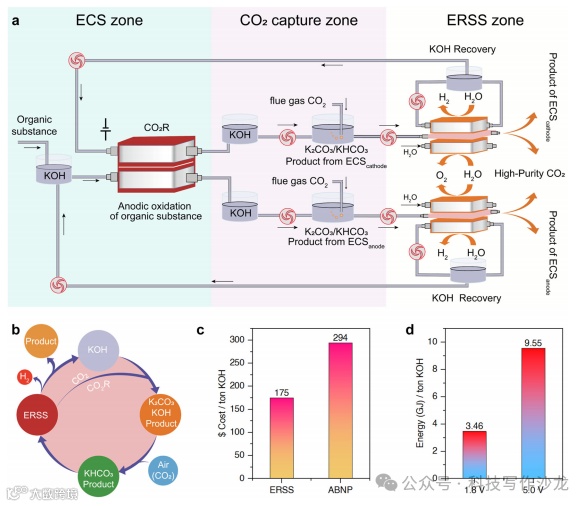 电解液回收和产品分离:传统的酸碱中和法不仅需要大量酸,还面临严重的腐蚀问题,且无法直接回收电解液。然而,这些方法的共同问题是:缺乏一个集成系统来同时解决CO2捕获、电解液回收和产品分离的问题。未能实现CO2的高效利用和闭环循环,导致成本高且难以工业化。