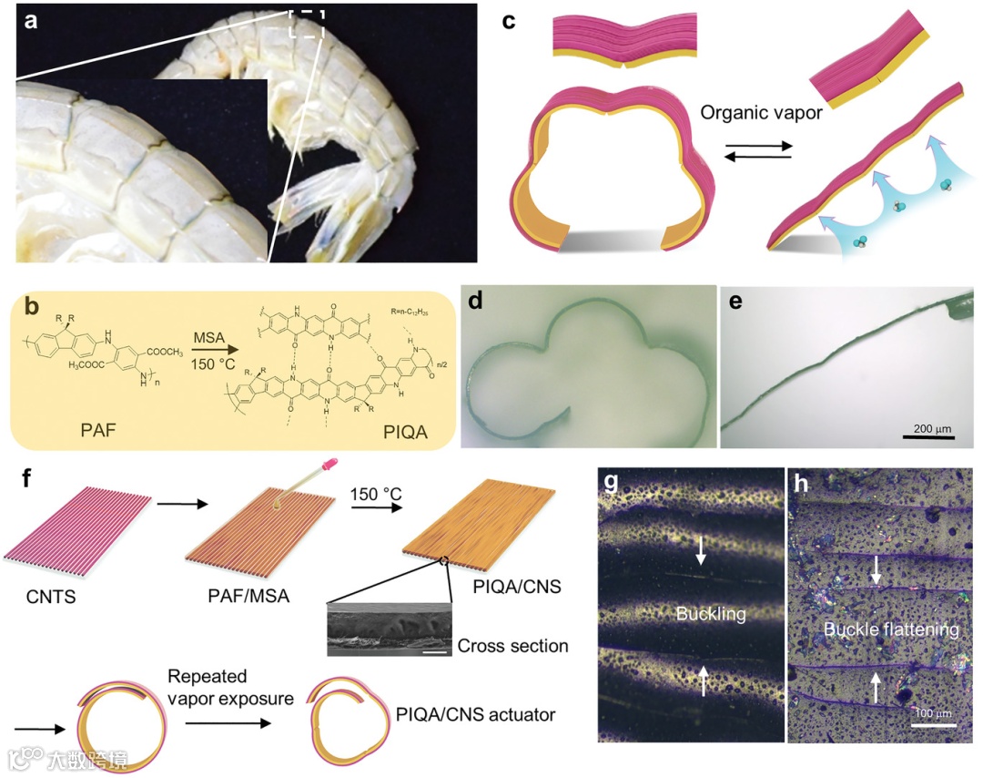 近日,南开大学刘遵峰教授、Zhou Xiang教授和美国德州农工大学方磊教授团队开发了能够承受恶劣条件的紧凑、鲁棒的跳跃机器人。对驱动力强、响应时间短、弯曲曲率大、环境耐受性好的要求是材料设计的重大挑战。为了应对这些挑战,本研究采用一种薄膜跳跃执行器的制造方法,该执行器表现出虾壳结构,由碳纳米管(CNT)片连接的共轭梯形聚合物(cLP)制成。cLPs作为驱动材料的应用还没有被探索,通过仿生刚柔虾壳结构可以克服刚性薄膜的低柔性。虾的外骨骼由软区域融合的硬段组成,非常灵活。此外,它们可以迅速弯曲成大曲率并跳得非常高。这种刚性而灵活的结构已被一些人工设计所采用,但尚未应用于制备跳跃执行器。分级多孔结构保证了有机蒸气的快速吸收和解吸,从而实现了高响应率。执行器在高达225℃的温度和浓硫酸中以及浸入许多有机溶剂中时不会出现形状变形。这项工作为在恶劣和复杂条件下运行的高性能执行器提供了一种新的设计策略。相关研究发表在《Advanced Materials》上。(徐锐)