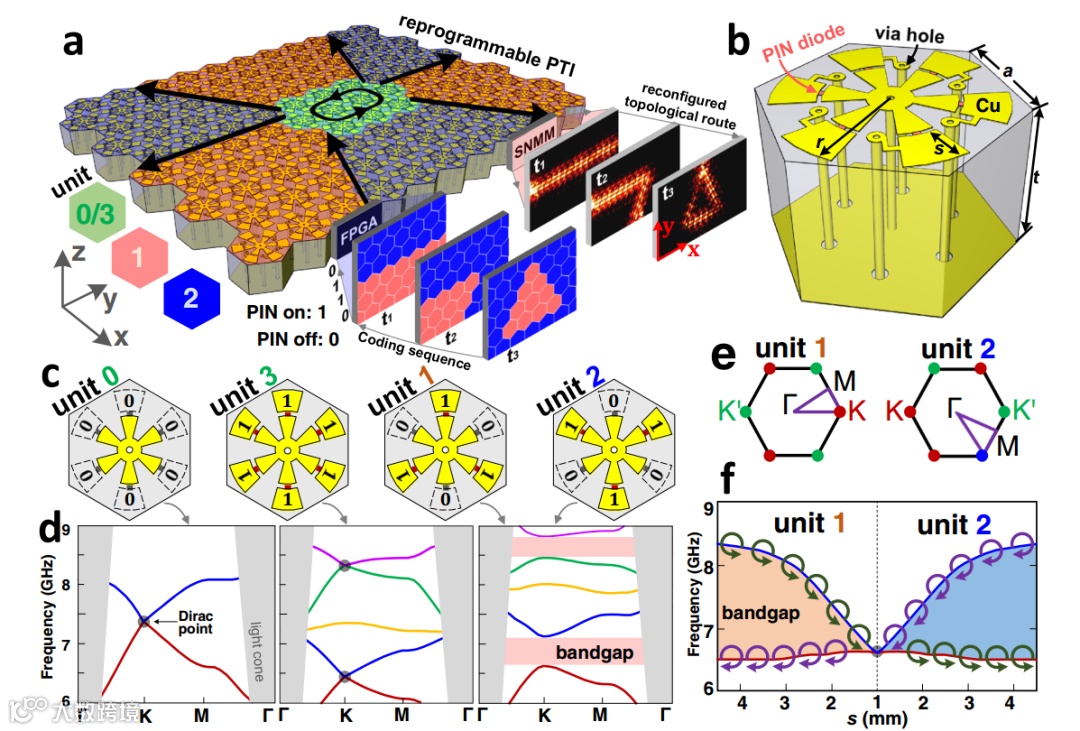 近日,来自伦敦大学学院的Nicolae C. Panoiu和东南大学毫米波国家重点实验室崔铁军院士团队在该领域取得新进展,从理论上提出并通过实验证明了一种可再编程的等离激元拓扑绝缘体,其中拓扑传播路径可以在纳秒级切换时间动态改变,从而实现了超快多通道光模数转换器的实验演示。由于创新地使用电开关来实现等离激元拓扑绝缘体的可编程性,每个晶胞都可以通过动态控制其数字等离子体状态进行编码,同时保持其几何形状和材料参数不变。与现有的光子拓扑绝缘体相比,该可再编程光子拓扑绝缘体有两个独特的特点:首先,它的可编程性是通过对 PIN二极管的二进制状态进行电编码来实现的,从而实现对不同拓扑传播路径的超快动态控制;其次,该可重构光子拓扑绝缘体采用广泛使用的印刷电路板 (PCB) 技术制造,因此可以与常用的基于 PCB 的光电集成电路无缝集成。这些特性对于开发用于未来实际应用的多功能智能拓扑光电器件至关重要。相关研究工作以“Reprogrammable plasmonic topological insulators with ultrafast control”为题发表在《Nature Communications》上。(周玉宇)