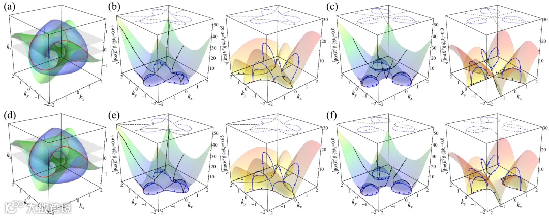 图3: (a).理论数值模拟无微扰时,三维系统中结式奇异线能带结构。(b-c).无微扰下,相应实验采样结果。(d). 理论数值模拟随机微扰下,三维系统中结式奇异线能带结构依然存在。(e-f).随机微扰下,实验采样结果。