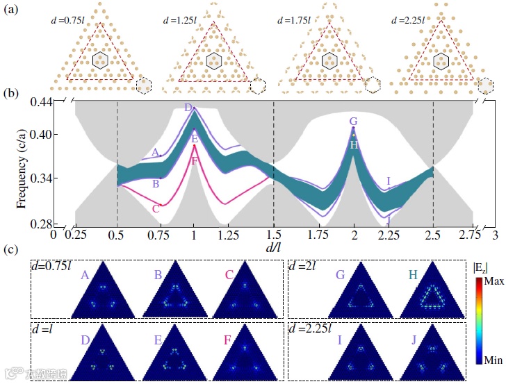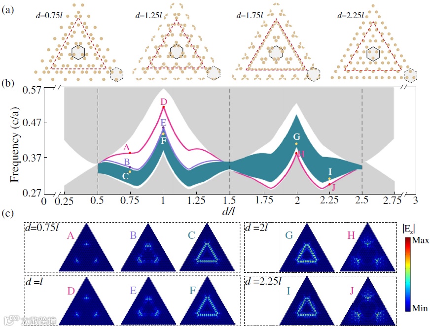 图3 (a)由两种类型光子晶体组成的的三角形超原胞的示意图,其中外部光子晶体的几何参数d=0.25l(对应的拓扑指标为χ=[0,0]),内部的光子晶体的拓扑性质可随d改变而改变。示意图中给出了四种典型的情况。(b)对应超原胞的本征频率与几何参数d的关系,其中灰色区域表示体态,绿色区域表示边缘态,红色和紫色曲线分别表示I类和II类角态。(c)不同d情况下角态和边界态的电场分布。在计算中,超原胞外部结构的边长为10a,内部结构的边长为4a。