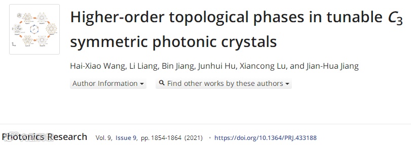 如何进一步丰富经典波动系统中的拓扑相并揭示相应的拓扑相变机制是目前领域内的研究热点。近日,广西师范大学王海啸课题组在研究具有C3对称性晶格光子晶体时,发现只需改变单个几何参数便可触发多个高阶拓扑相变。不同的高阶拓扑相可通过两种不同的方式表征:(1)原胞Wannier中心的位置;(2)高对称点C3对称性的本征值。通过对几何参数的连续调节,还可实现对高阶拓扑角态和边界态的调控。最后,研究人员还讨论具有C3对称性下不同光子晶体的角态分数电荷与高阶拓扑相的关系。该工作进一步丰富了光子系统中高阶拓扑相及其相变的机制。相关成果以‘Higher-order topological phases in tunable C3-symmetric photonic crystals’为题于2021年8月31日发表在《Photonics Research》上,并被编辑标记为Editor’s Pick。广西师范大学王海啸博士与苏州大学蒋建华教授为本文的通讯作者,硕士生梁力为本文的共同第一作者。