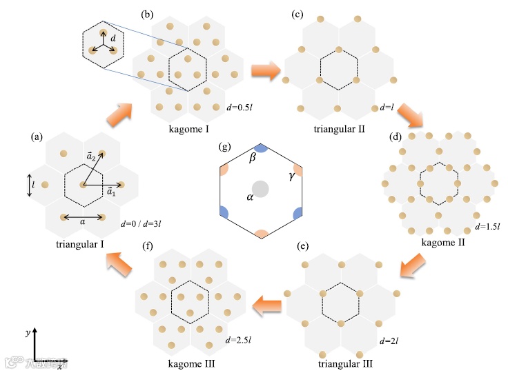 图1满足C3对称性的不同二维光子晶体间随几何参数d的相互演化,其中原胞晶格常数为a,每个原胞包含三个介质柱(半径r=0.1a、介电常数ϵ=15),介质柱距离中心为d。通过调整几何参数d,在保持C3对称性的同时可以产生各种不同的构型,包括:(a) triangular I (d=0 ∕d=3l) , (b) kagome I (d=0.5l) , (c) triangular II (d=l), (d) kagome II (d=1.5l), (e) triangular III (d = 2l), 和 (f) kagome III (d= 2.5l)。 (g) 具有C3对称性光子晶体原胞可能的Wannier中心位置。