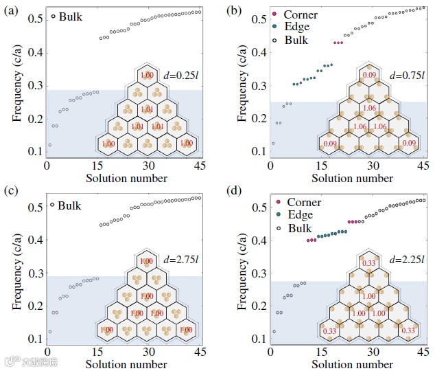 图4 (a)由两种类型光子晶体组成的的三角形超原胞的示意图,其中内部光子晶体的几何参数d=0.25l(对应的拓扑指标为χ=[0,0]),外部光子晶体的高阶拓扑性质可随d的改变而改变,示意图中给出了四种典型的情况。(b)对应超原胞的本征频率与几何参数d的关系,其中灰色区域表示体态,绿色区域表示边缘态,红色和紫色曲线分别表示I类和II类角态。(c)不同d情况下角态和边界态的电场分布。