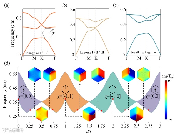 图2 具有C3对称性的二维光子晶体的能带结构。(a) d =0,l,2l (对应triangular I, II, III),(b) d = 0.5l,1.5l,2.5l (对应 kagome I, II, III),和 (c) d=0.25l,1.25l,2.25l (对应breathing kagome)。 (d)第一和第二光子能带在K点处的本征频率。不同拓扑的带隙(不同的颜色区域),可由拓扑指标χ及相应Wannier中心位置表征。插图给出了不同几何参数d时,第一光子能带在K点处本征态的相位分布。
