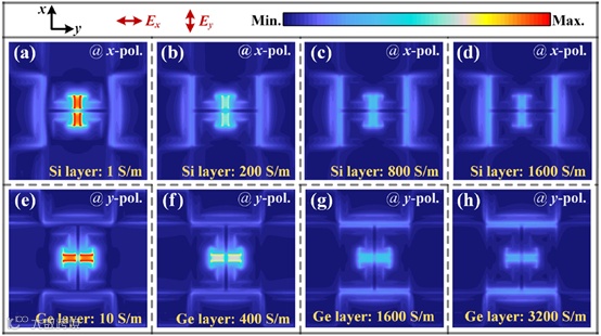 (a-d)通过逐渐增加硅层的电导率,获得与x偏振太赫兹入射相对应的单元内的电场分布。(e-h)通过逐渐增加硅层的电导率,获得与y偏振太赫兹入射相对应的单元内的电场分布。